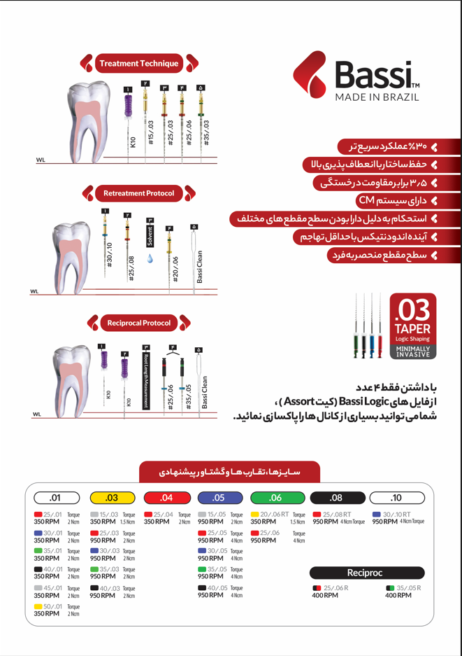 Bassi Logic یک سیستم فایل روتاری از جنس NiTi است که در واقع، عملکرد و ایمنی بیشتری نسبت به سیستم هایی که دارای یک شکل سطح مقطع هستند، دارد.