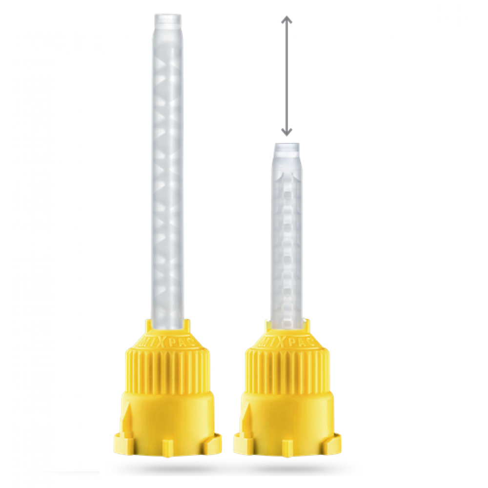 با توجه به طراحی کوتاه تر، ضایعات مواد در نوک مخلوط را بیش از 25% کاهش می دهد،میکسر های جدید حدود 40% از میکسرهای هلیکس کوتاه تر می باشند و هیچ اثر منفی از نظر استفاده عملی برای اختلاط مواد مشکلی به وجود نمی آورند و برعکس: تی میکسرهای کوتاهتر در موقعیتهای خاص سریعتر هستند و اختلاط یکسان باعث از دست دادن مواد کمتری می شود